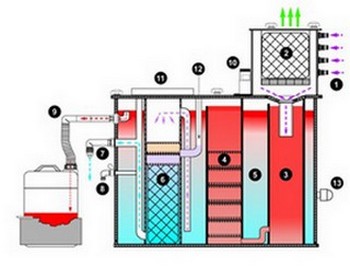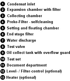 filter to exhaust air This expansion and de-airation chamber assures a chalm surface in the separator, even if the condensate is fed under pressure. The activated charcoal filter eleminates the oil from the exhaust air.