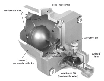 The pilot valve (4) relieves the perssure chamber above the membrane (5). The pressure of the condensate lifts the membrane